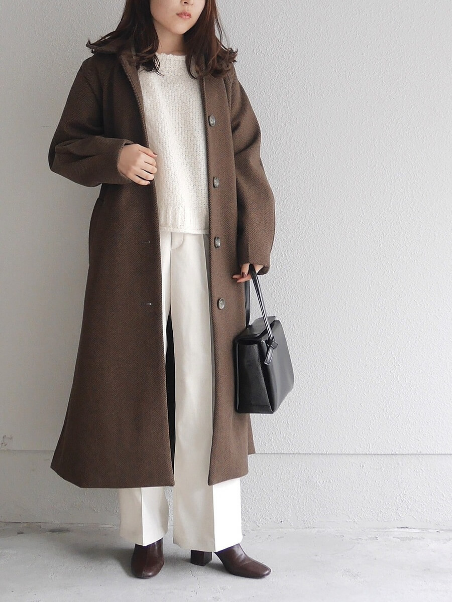 通勤シーンにはノーカラーコートをサッと羽織ると、大人のスマートな冬コーデにシフトチェンジできますね。 ホワイト×ブラウンのナチュラルカラーのコーディネートに、黒バッグで引き締めてバランスよく。