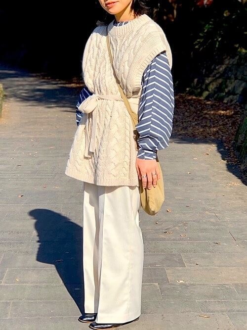 【オフホワイト】ベストニットを合わせたカジュアルMIXコーデ