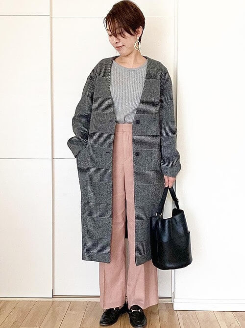 通勤コーデにはグレンチェック柄のノーカラーコートを羽織って、トラッドなクールさをミックスしましょう。