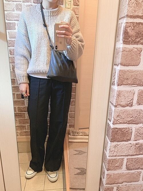 そんなきれいめパンツにざっくりニットをコーディネートしてカジュアルダウン。インナーの白トップスをチラ見せして、抜け感をアピールしましょう。