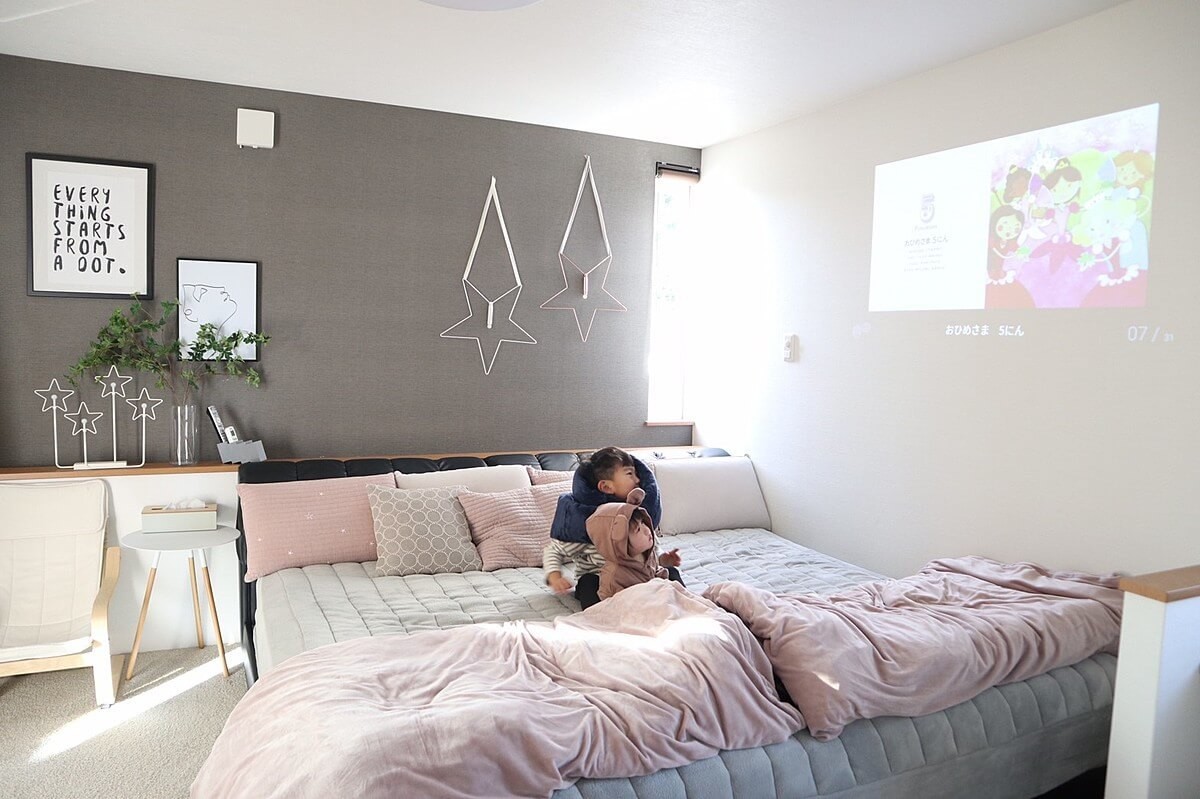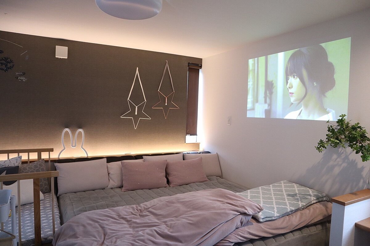 映像だけではなく、サウンドも映画館のようで圧倒的に非日常的な寝室になりました。休日の夜は早めにお風呂入って、家族で映画をみるのが定番になっています。
