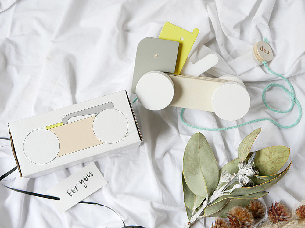 シンプルながらお洒落なパッケージ入りなのでギフトにぴったり。かわいいプルトイを引っ張っている姿を想像したくなりますね。