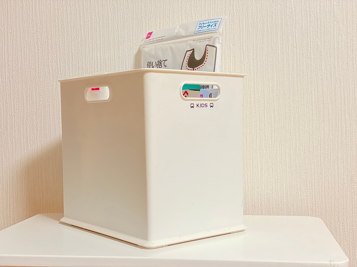 わが家では、収納グッズは、カラーボックス用の縦ハーフサイズのケースを愛用。万が一、吐き戻してしまうときに、スーパーの袋をケース内に広げることもできます。
