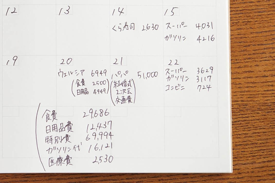 家計簿に記入するのは、「買い物をした店」や「お金を使った場所(レジャー施設など)」、そして「金額」だけ。