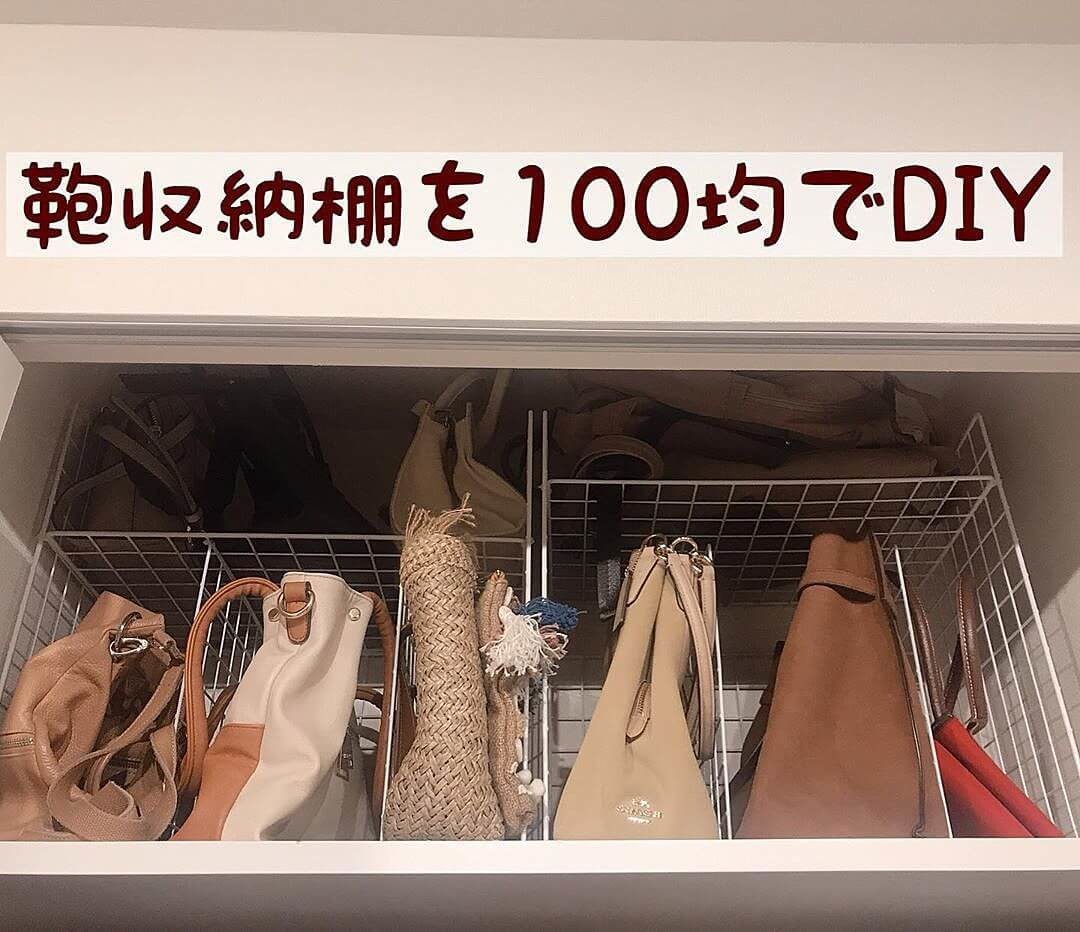 使い勝手の難しいクローゼットの上部は、カバン専用棚を作って実用的にチェンジ! 家によって収納サイズが異なるので、ぴったりサイズのワイヤーネットを探すのがポイントです。片づけたいカバンの大きさに合わせて高さや幅も調節できます。
