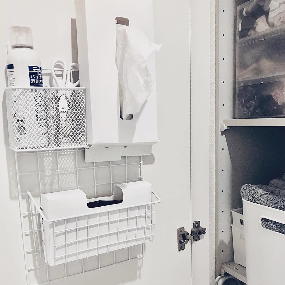 こちらもワイヤーネットを使った便利収納。ワイヤーラックをひっかければ扉裏のデッドスペースまで無駄なく利用できるんです。