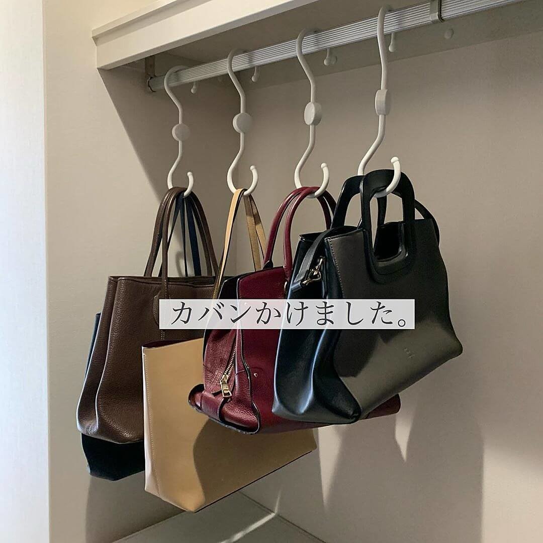 @mhome_98さんは、大きめのセリアのS字フックでカバンを収納しています。クルクル回るフックなのでカバンが重ならず、スッキリ収まるところが魅力です。
