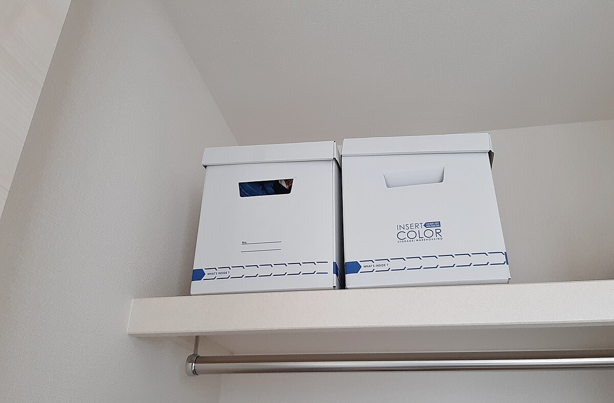 シーズンオフやサイズアウトの物たちなので使用頻度が低いクローゼットの上の段に置きました。中身が見えないのでラべリングしたらもっと使いやすくなりそうです。