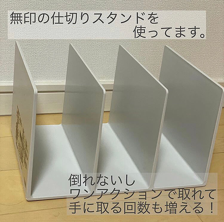 @shio.lemonさんは、無印良品から販売されている仕切りスタンドを本の収納に活用しています。