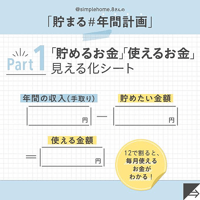 まずは1年間の収入(手取り)から、『貯めるお金=目標の貯金額』を引くと、一年間で『使えるお金』が見えてきます。これを12で割れば、毎月使える予算が明確に!この予算を徹底キープすることで、自然と貯まる仕組みができあがります。