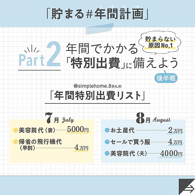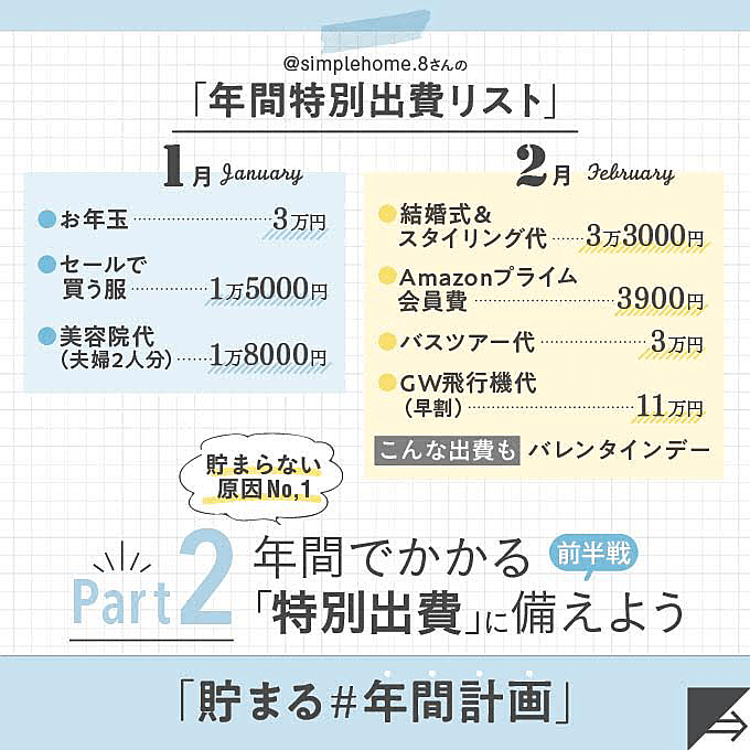 「まずは『貯めたいお金』と『使えるお金』を見える化することで、わが家の『貯まる方程式』を作りました!そのうえで、1年間でかかる出費=「#年間特別出費」を書き出して、貯めたいお金を取り崩さずにすむよう「いつ、いくら必要か」という計画を立てます。年間でかかる特別出費は、赤字の大きな原因になるので、この作業はとても大切なのです」