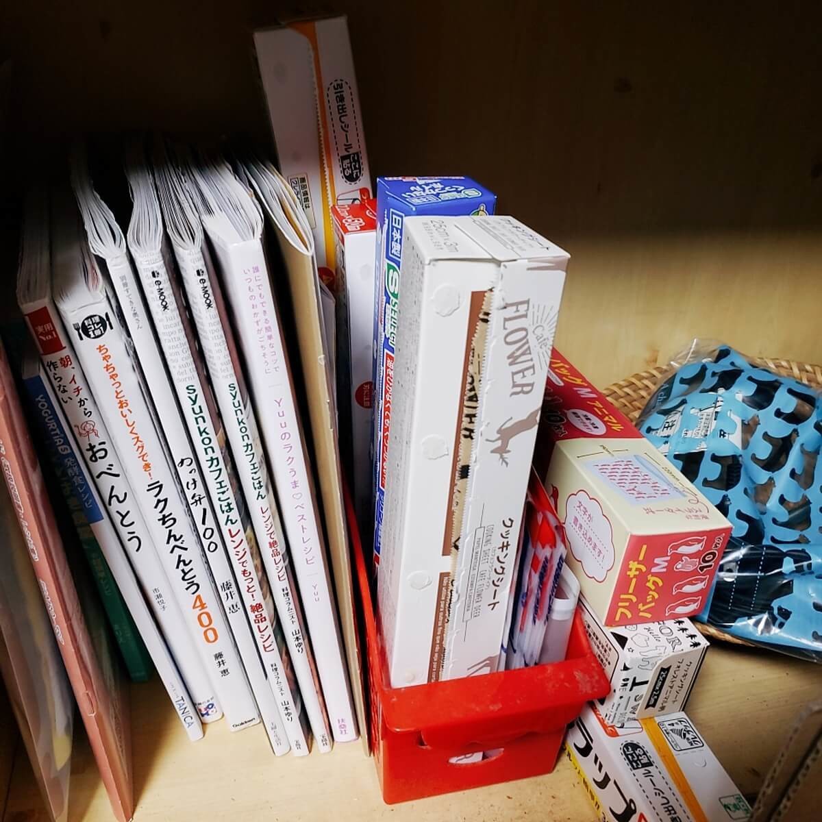 使用頻度の下がる2軍を書類スタンドに差し込み、料理本などと一緒に棚の中に。