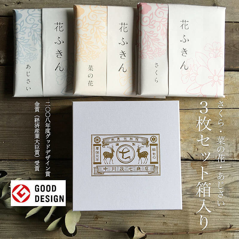 「遊 中川」のロングセラー商品でもある花ふきんは、吸水性と速乾性に優れた蚊帳生地を使ったふきんです。 さくら、菜の花、あじさいの3色セットになっており、どれも淡く優しい色合いで新築祝いのお返しにもぴったり。