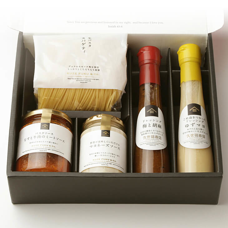 もらって嬉しい久世福商店の「もちもち生パスタギフト」です。 生パスタ、パスタソース、マヨネーズソース、ドレッシング2本がセットになった充実のセット内容!