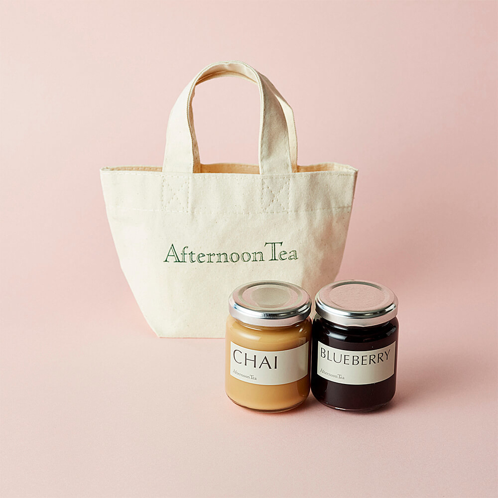 おしゃれなミニトートバッグが付いた、アフターヌーンティーのジャム2個セットです。 ちょっぴり珍しいチャイ味のジャムとブルーベリージャム、どちらもアフターヌーンティーの人気商品です。