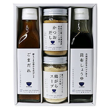 こちらは料理家の栗原はるみさんがプロデュースした「味の決め手セット」です。 ごまだれ、かつおぶし、鶏がらスープ、昆布しょうゆの嬉しい4点セットです。