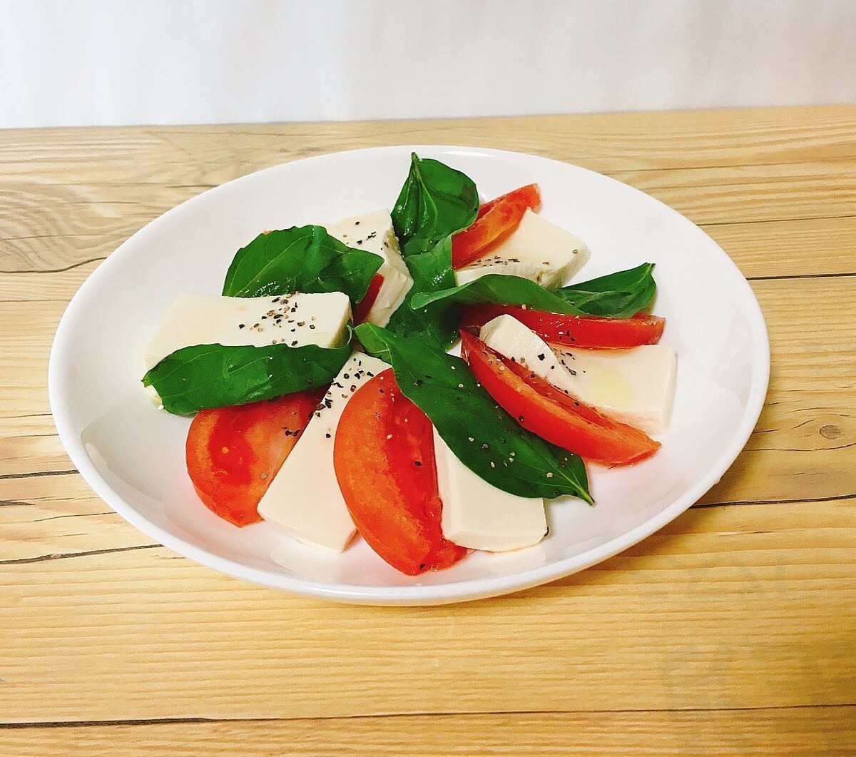 そのまま食べてもおいしいですが、今回はカプレーゼ風にアレンジしてみました。スライスした塩豆腐とトマト、バジルを交互に並べます。豆腐には塩がしっかりと浸み込んでいるので、オリーブオイルとブラックペッパーはほんの少しでOK。