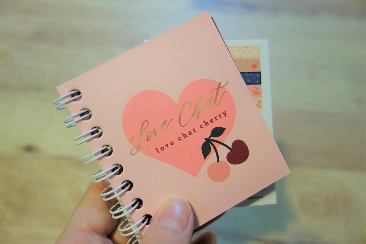 チェリーシリーズには他にも、リングメモやノート、ボールペン、ペンケース、旅行に役立つメッシュケースや折り畳みスリッパなど、いろいろなアイテムがあります。