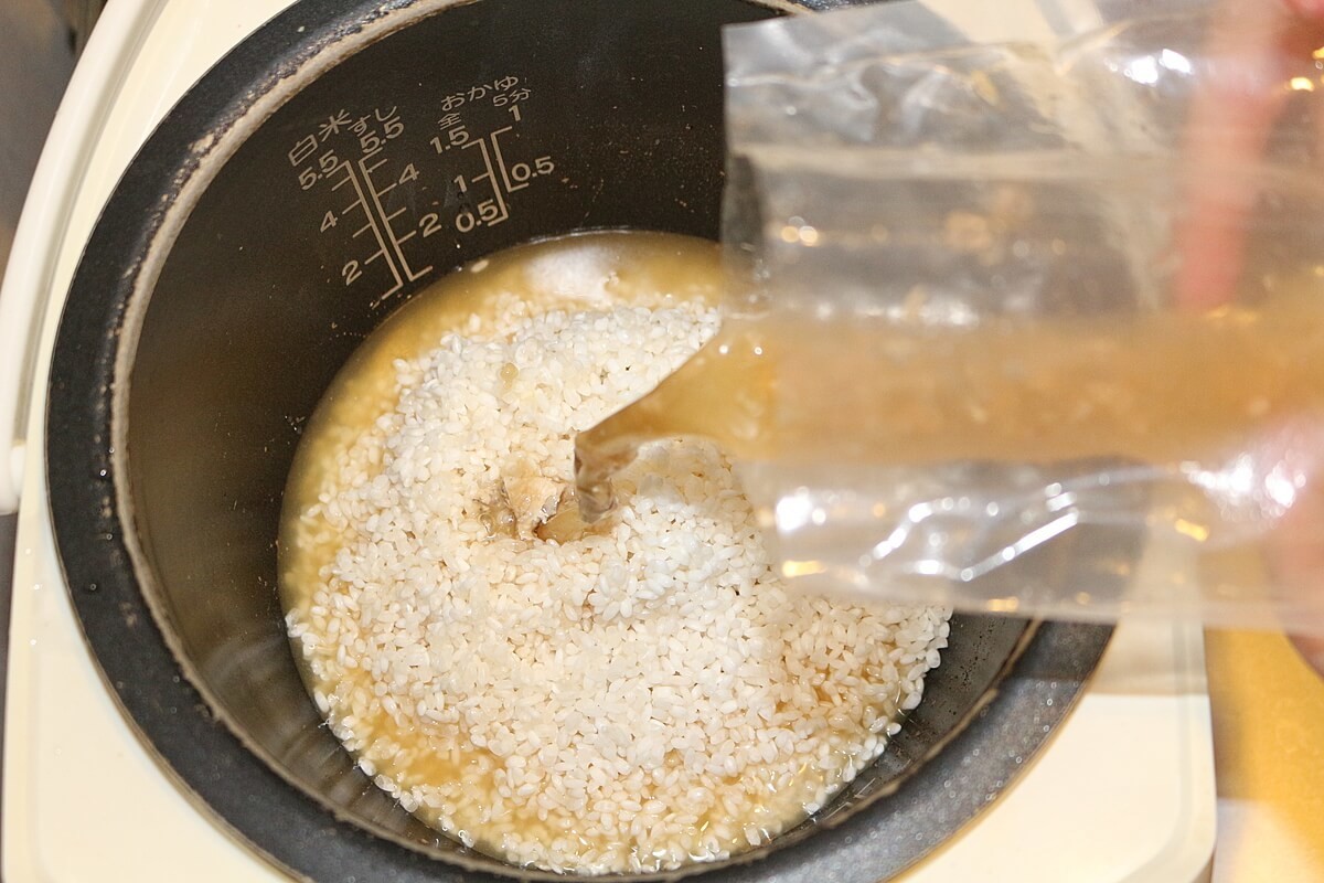 (1)お米2合をとぎ、水を切り、その中に液ごと本品を入れます。