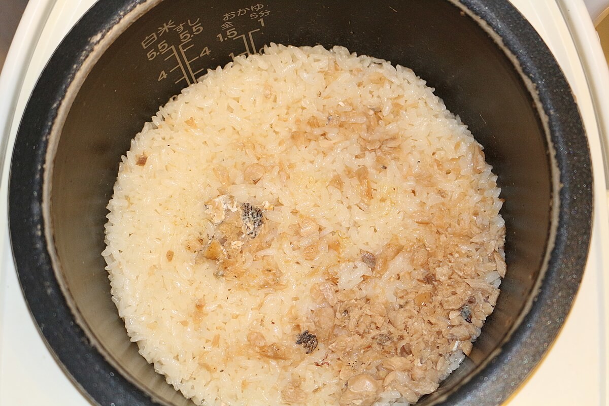 (2)2合の白米を炊く水加減で、具を軽くかき混ぜて炊きあげます。