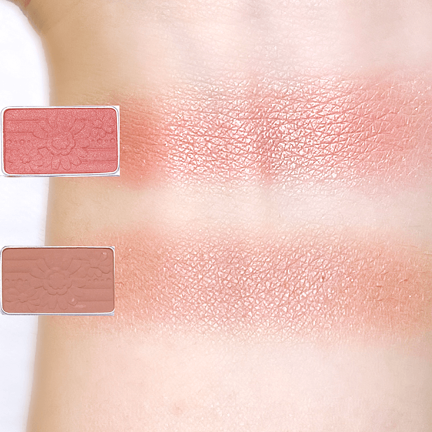 頬にのせると、メロウピーチは光の加減で少しオレンジっぽくも見えるピンクに発色しました。