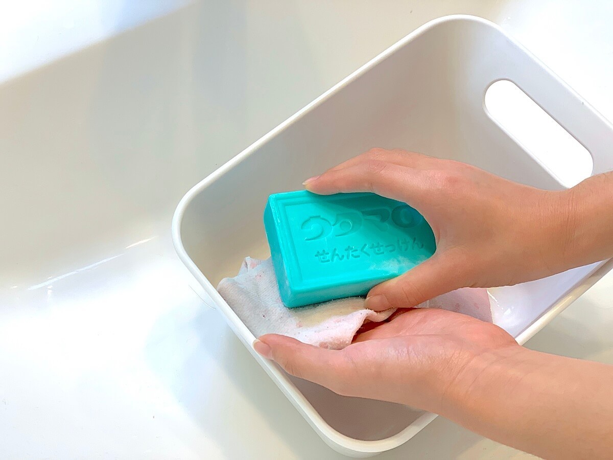 汚れが気になるところにウタマロ石けんを塗り込んでもみ洗いするだけ。特別な作業は必要ありません。