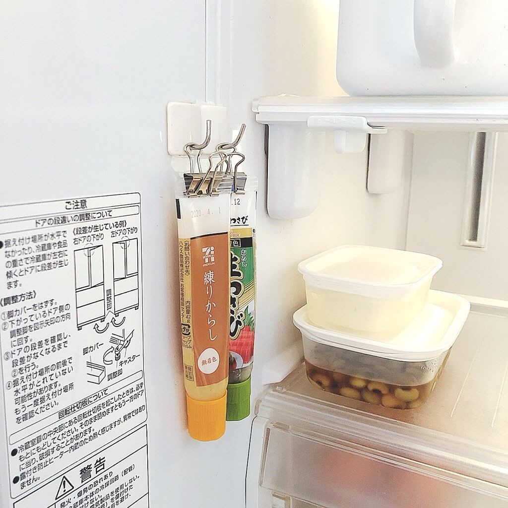チューブ系調味料は、ホルダーを使ってドアポケットに入れている方も多いと思いますが、わが家では ダブルクリップをつけて、庫内に粘着フックで吊るしています。
