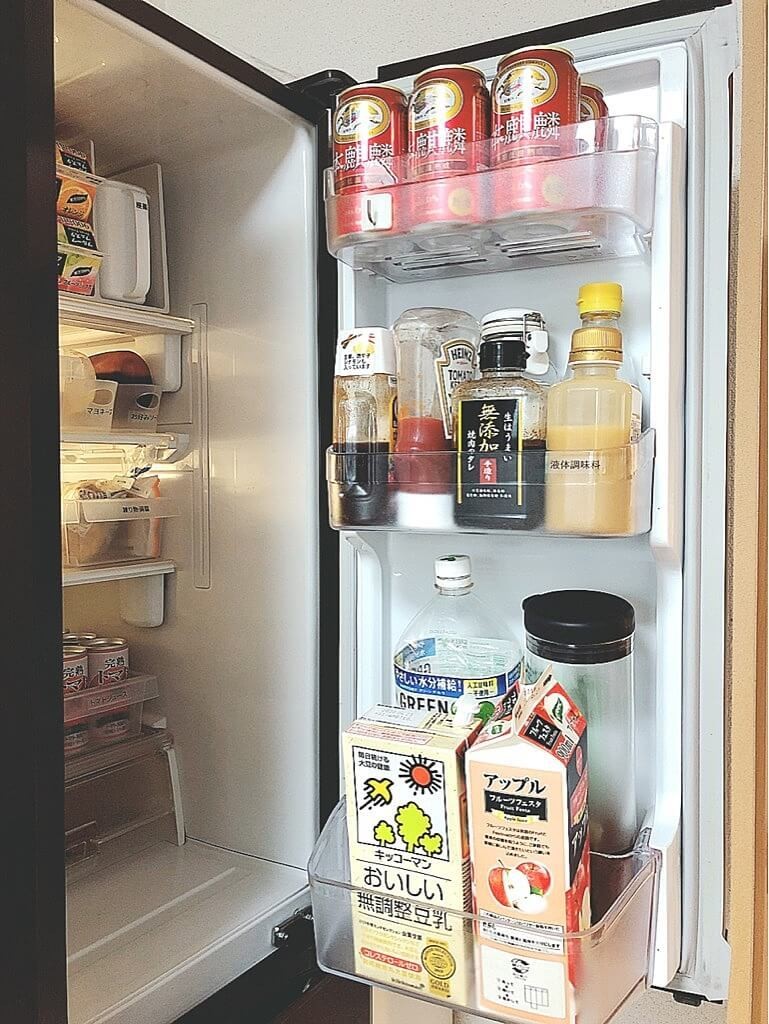 2段目にはよく使う調味料やドレッシング、ドリンクホルダーには今飲んでいるドリンクを入れています。