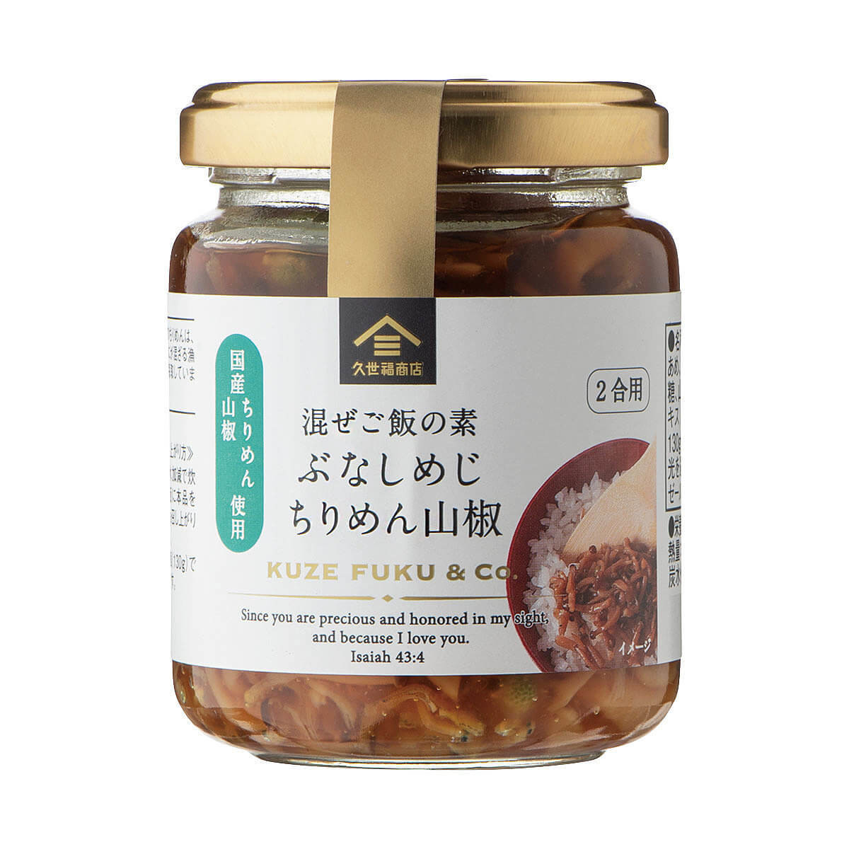 長野県産ぶなしめじと国産のちりめん、和歌山県産の山椒の実など、すべて国産の原料にこだわった久世福商店ならではのぶなしめじちりめん。