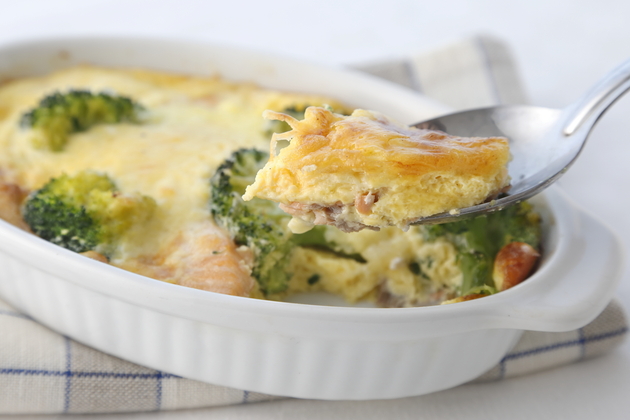 - ボウルにキッシュ液の材料をすべて入れ、よく混ぜ合わせる。オリーブ油適(分量外)を薄く塗った耐熱の器にサーモンとブロッコリーを並べ、チーズをかけてキッシュ液を流し入れる。オーブントースターで25分焼く。途中で表面が焦げそうなら、アルミホイルをふんわりとかける。