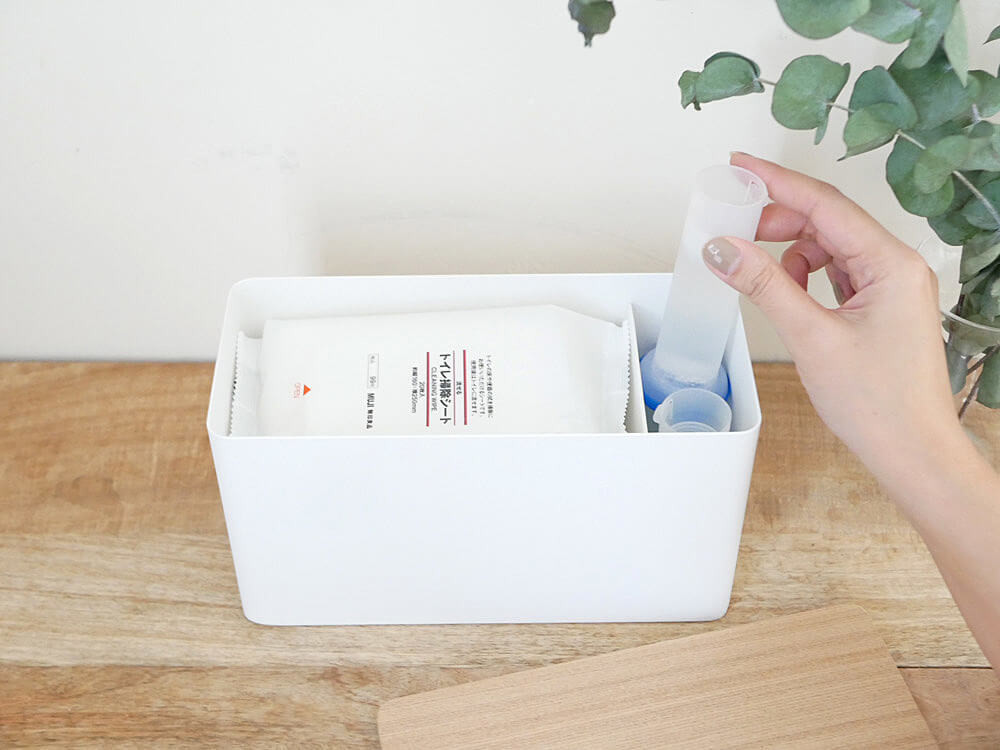 トイレのお掃除シートやトイレスタンプ、生理用品やゴミ袋などは、隠したいけど手の届く場所に収納したいものですよね。サニタリールームで散らかりがちな小物をまとめて収納出来て、使いたいときには蓋を開けてサッと取り出せる手軽さが◎。