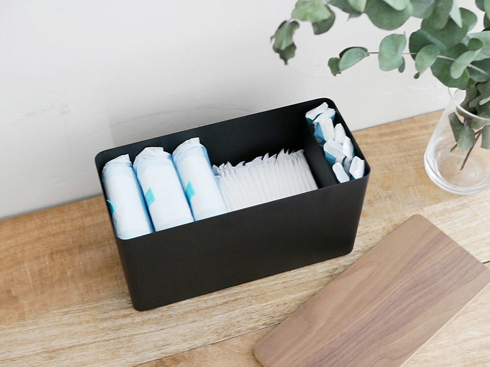 使用する分だけ入れ替えたり、例えば来客用としてこのケースにいれたりと使い方は様々。収納という用途よりもスマートに「隠す」が出来るサニタリーケースです。