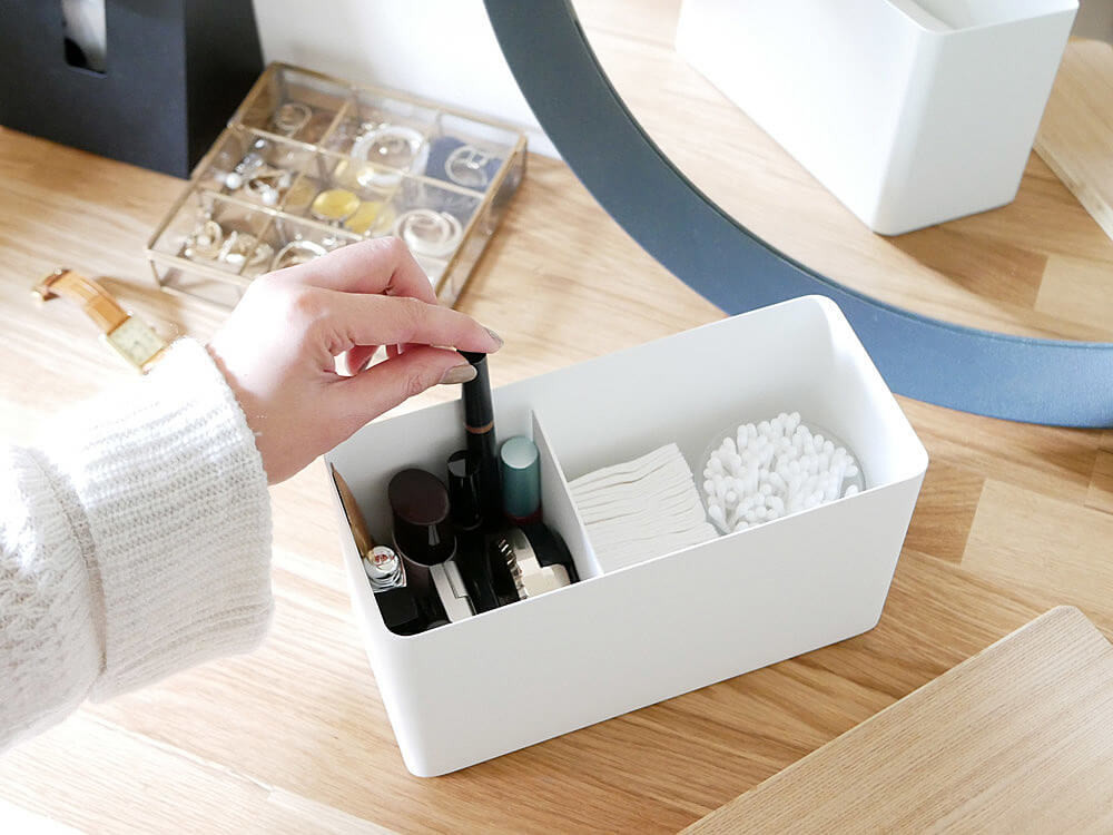 仕切りがあるので細々したメイク道具の整理にも最適で、綿棒も立てて入れることが出来ますよ。