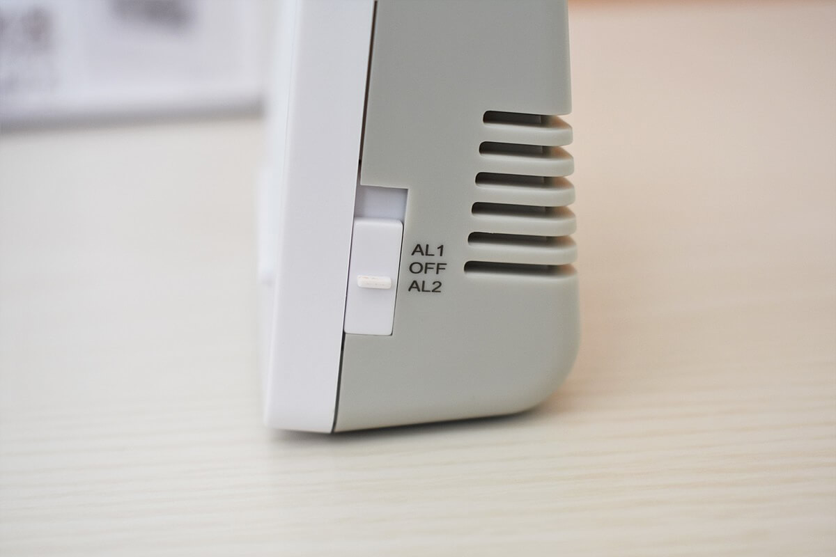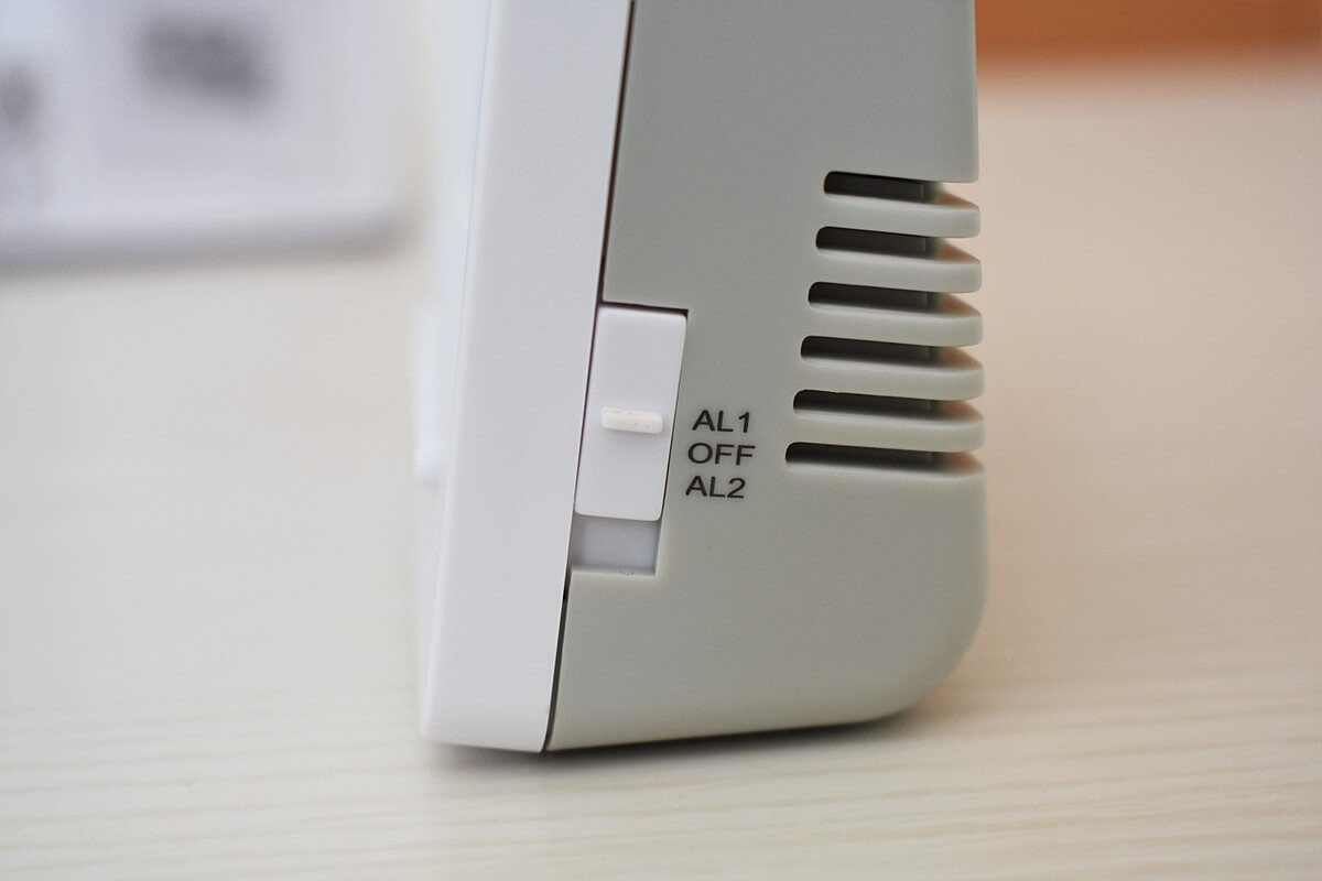 液晶画面の下を探しても「アラームセットボタンがない!」と困惑していたら、なんと向かって右側の側面にスライドボタンを発見。