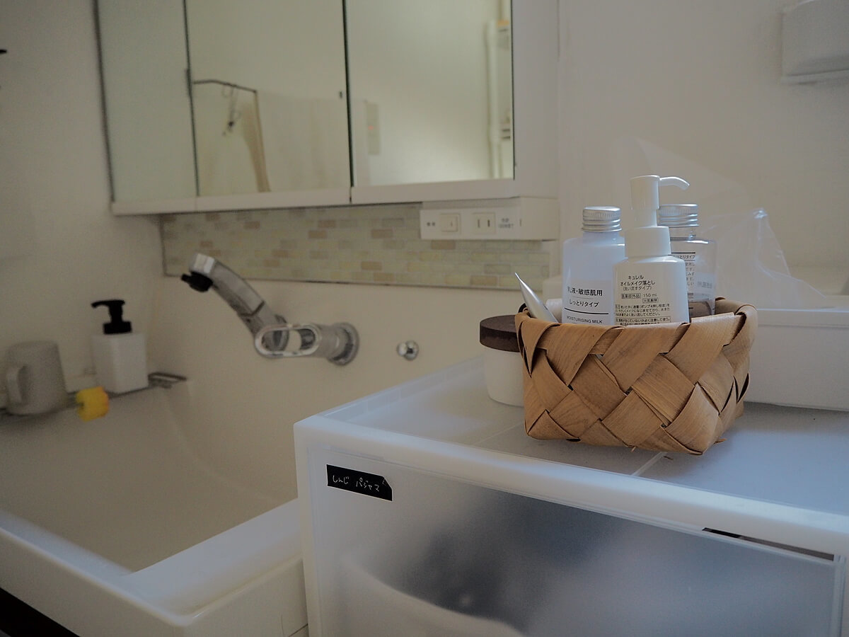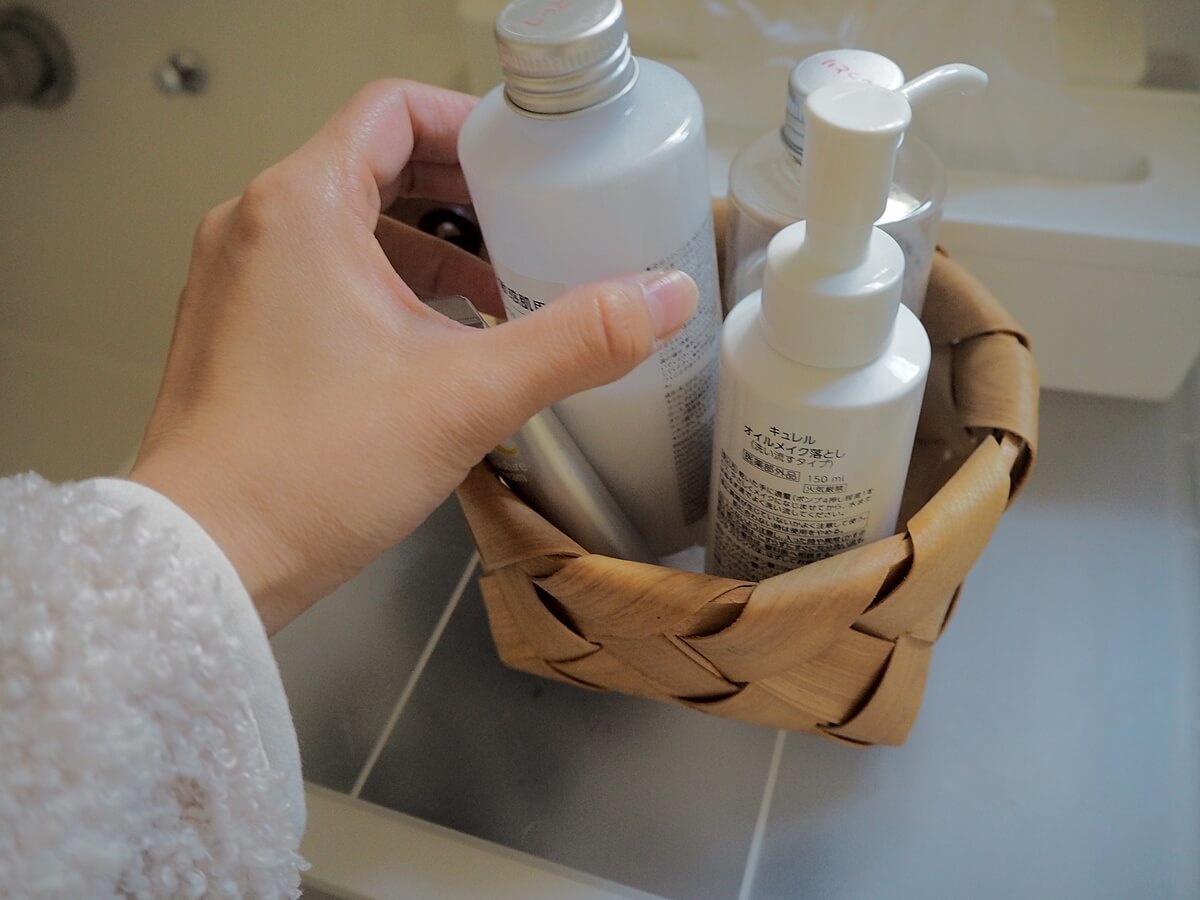 洗面所の脇に、化粧水などをまとめて収納するのに使っています。無印良品の化粧水を愛用しているのですが、ボトル三本分なら入ります。