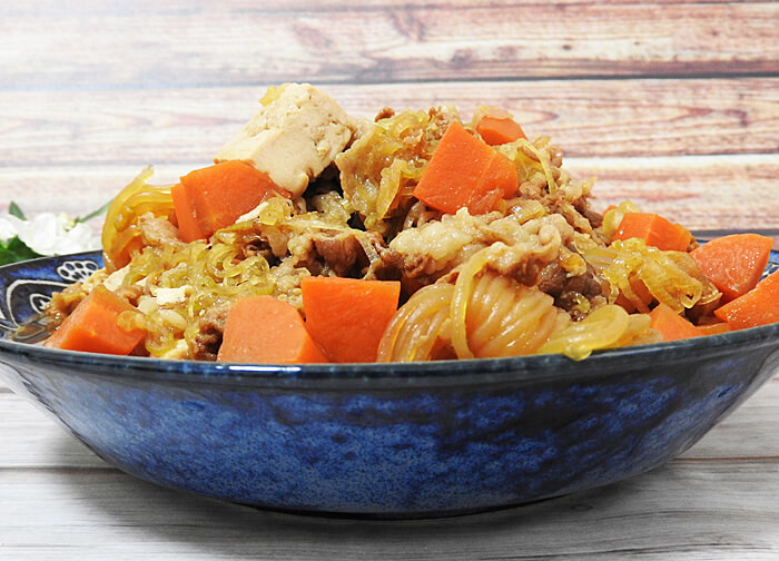 - しらたき・にんじん・ねぎ・豆腐に色がついて来たら火を止めて、粗熱が取れるまで待って完成