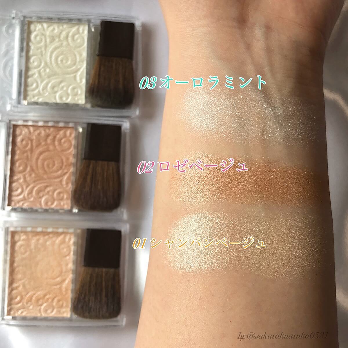 一方で、オーロラミントはふんわりとした粉雪のようなテクスチャーで、時折大粒のラメがキラキラと瞬きます。 指で触ったり、筆で実際肌につけてみると分かるのですが、01,02に比べてとてもサラサラとした粉質をしています。