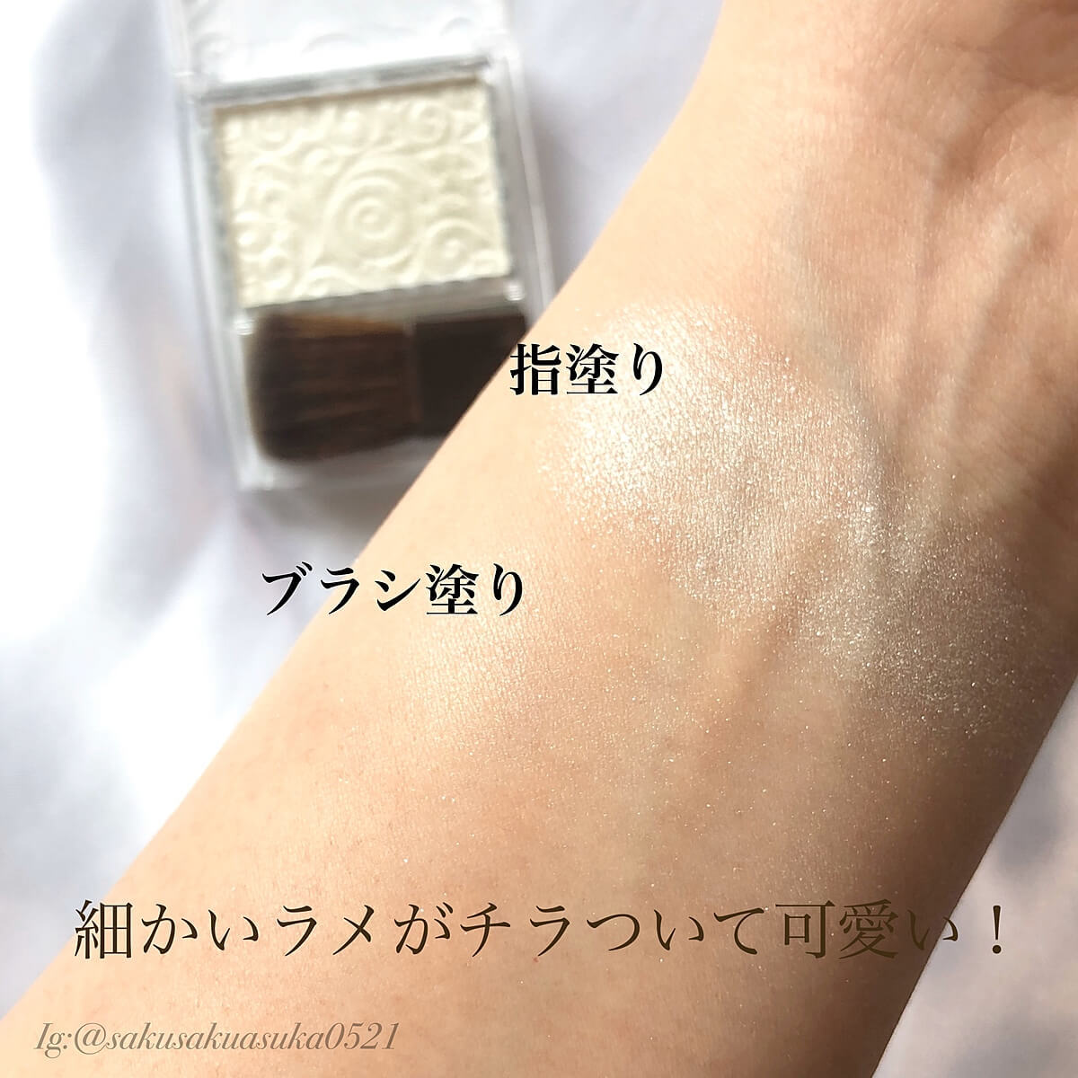 パッと瞬時に肌を明るくでき、また大きめのラメが入っているためとても可愛いので、アイシャドウベースとしてもおすすめ。