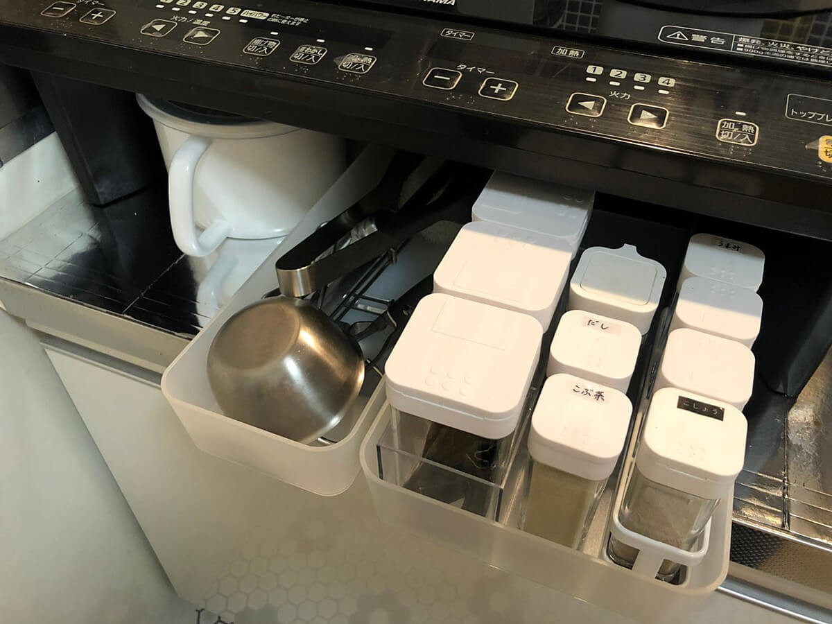 そのスペースには調味料やキッチンツールを収納しています。