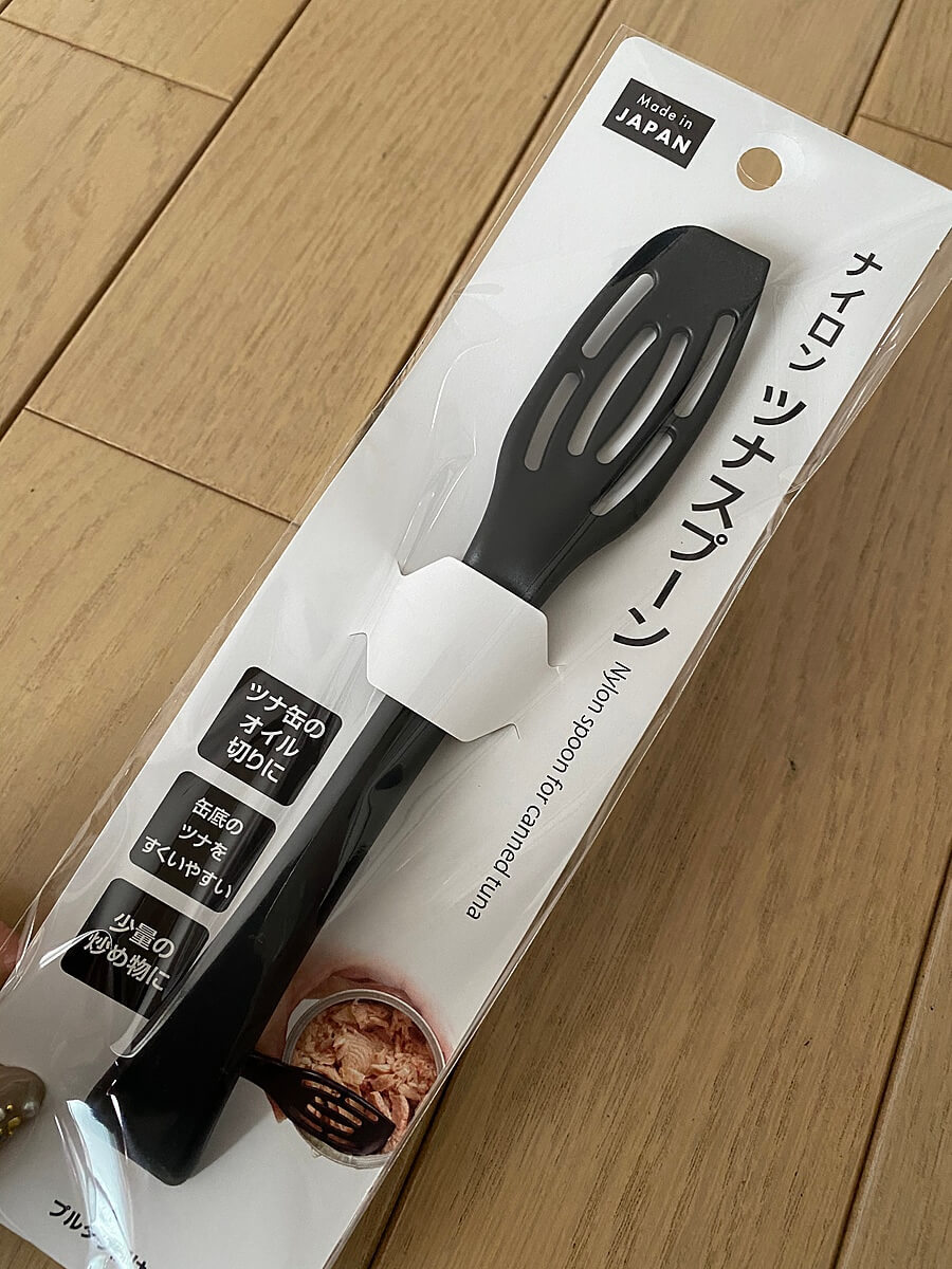 今までツナ缶を使うときは、蓋を開けきらずに、上からギュッと押さえて油切りしていましたが、今はこちらのスプーンが大活躍です。