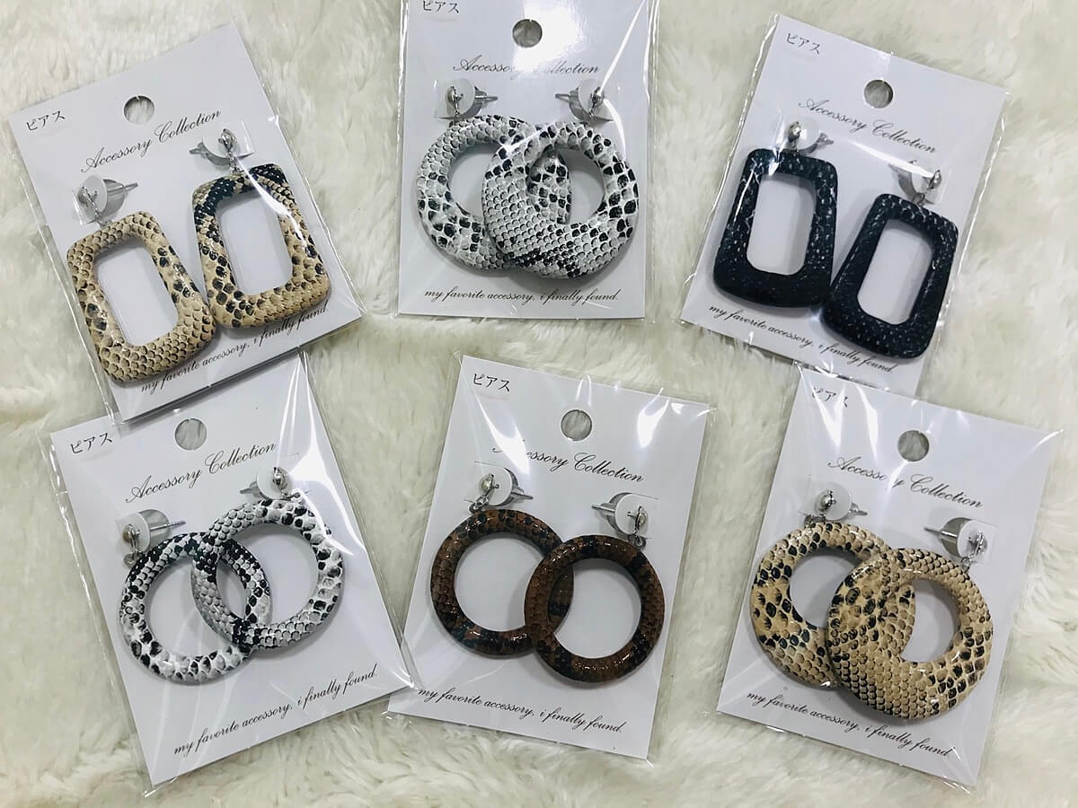 たくさんの形やカラーのパイソン柄ピアスをセリアで発見。