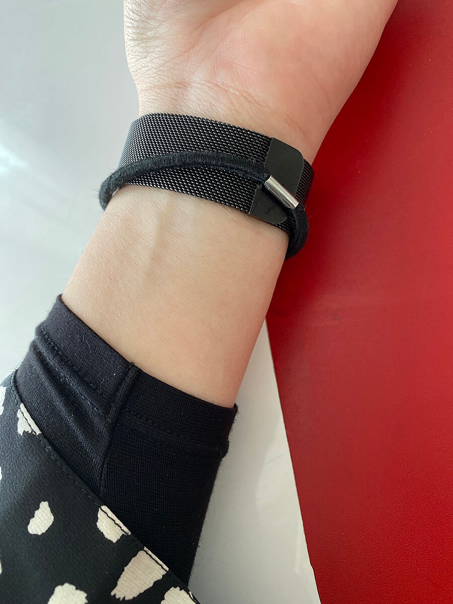 たまたま磁石つきの時計をしていたら、ゴムの金具がくっついてくれるので、手首でぐるぐる回らず固定。←偶然の産物。笑。