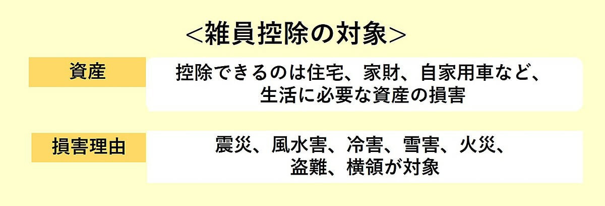 下表の通り、震災、風水害といった自然災害や火災などの人為災害に加え、盗難、横領も雑損控除の対象となります。ただし、詐欺や恐喝による損害は対象外となるので要注意。例えばオレオレ詐欺の被害による損害は、雑損控除の対象とはなりません。