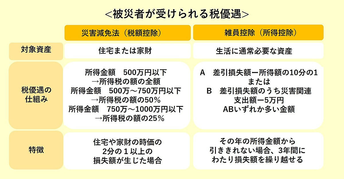 被災者が受けられる税制上の税優遇には、雑損控除以外にも災害減免法という制度があり、被災者はいずれか有利な方を選ぶことができます。