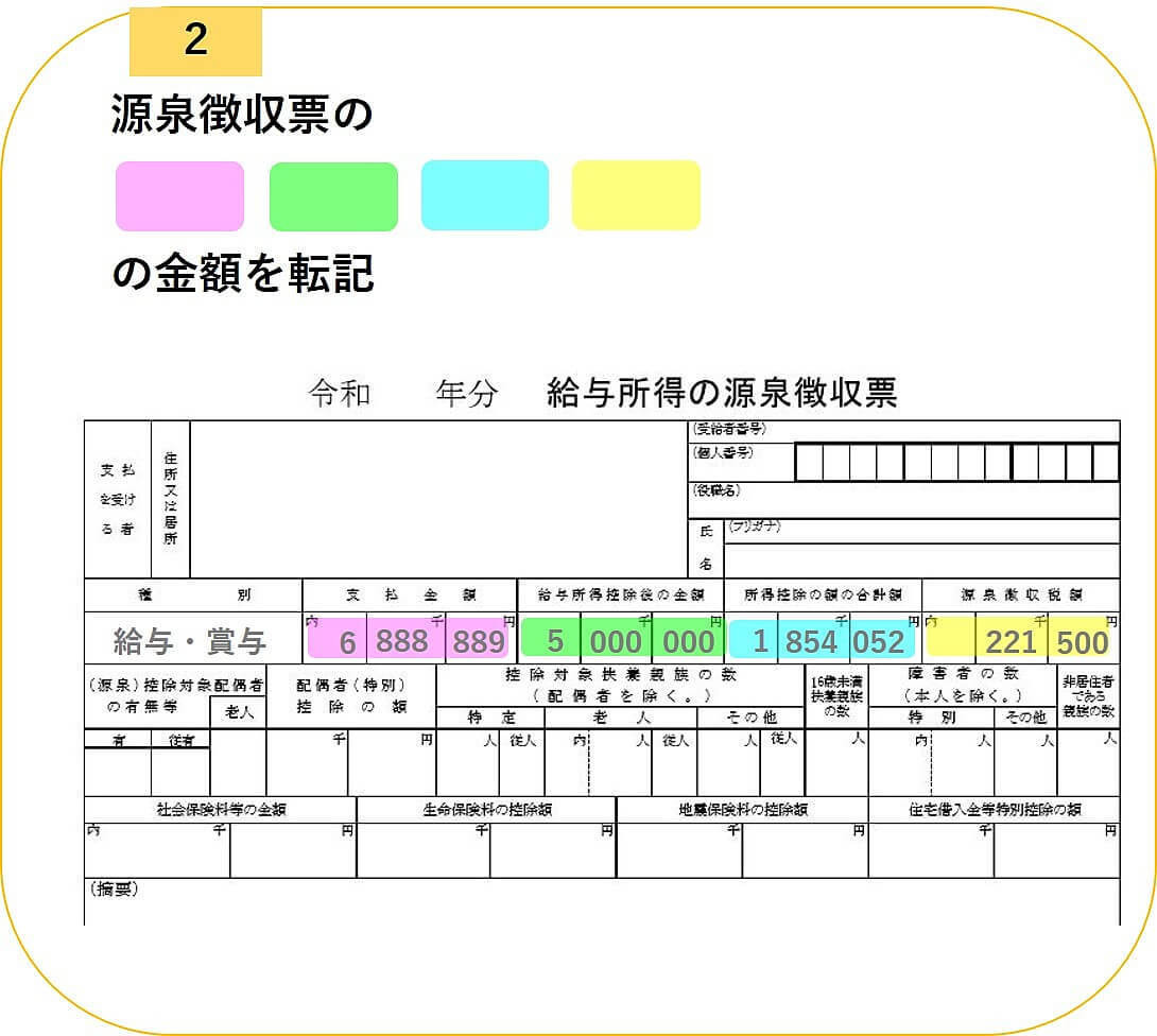 源泉徴収票の「支払金額」を申告書A第一表の「ア」の欄に、「給与所得控除後の金額」を①と⑤に、「所得控除の額の合計額」を⑯に、「源泉徴収税額」を㊳に、それぞれ転記しましょう。