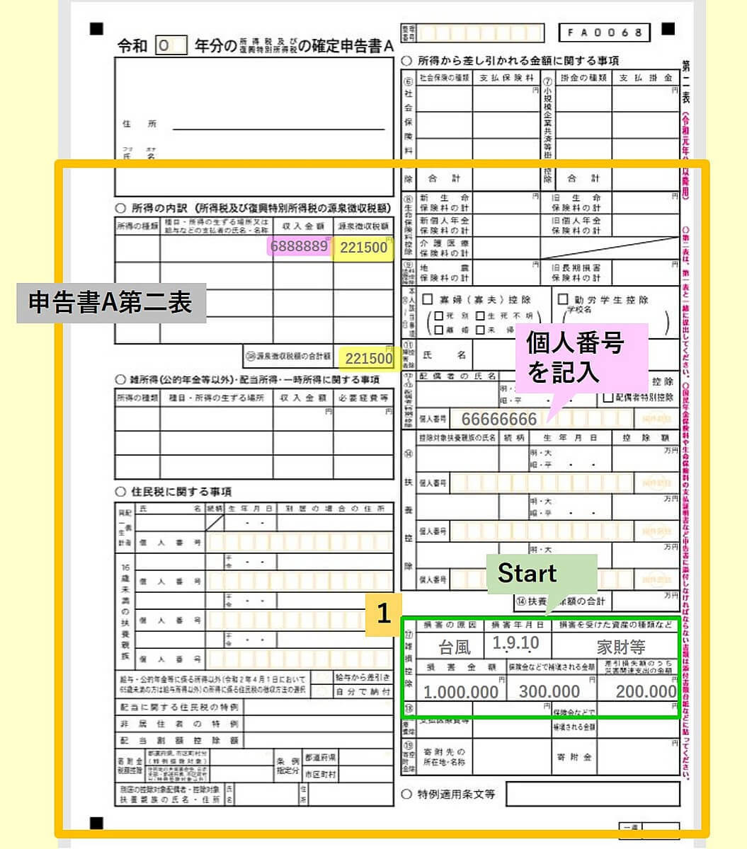 申告書A第二表の「雑損控除」の欄に、損害の原因、年月日、損害を受けた資産の種類、損害の金額、保険金などで補填される金額、差引損失額のうち災害関連支出の金額を、それぞれ書き入れましょう。