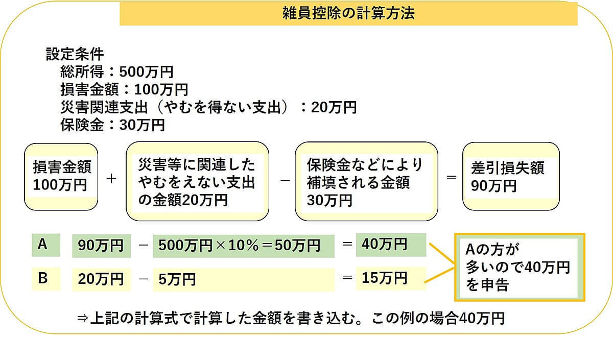 この場合はAの方がBよりも金額が大きかったため、Aの40万円が雑損控除として差し引かれる金額となります。