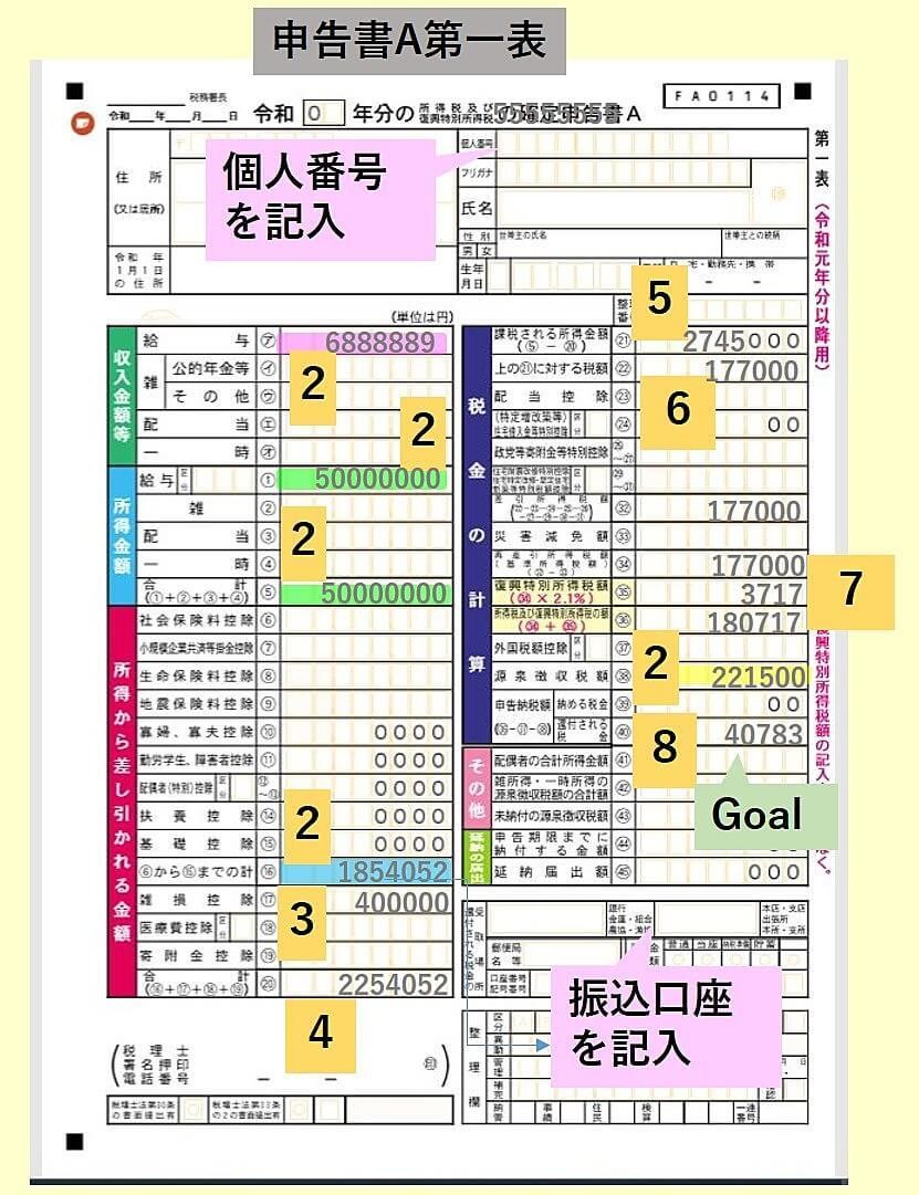 それでは先ほどの例を基に、確定申告書への実際の記入方法について、流れに沿って見ていきましょう。