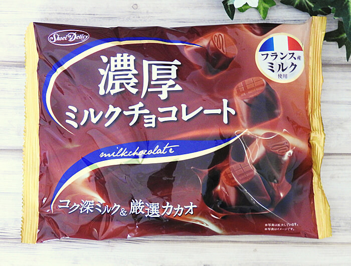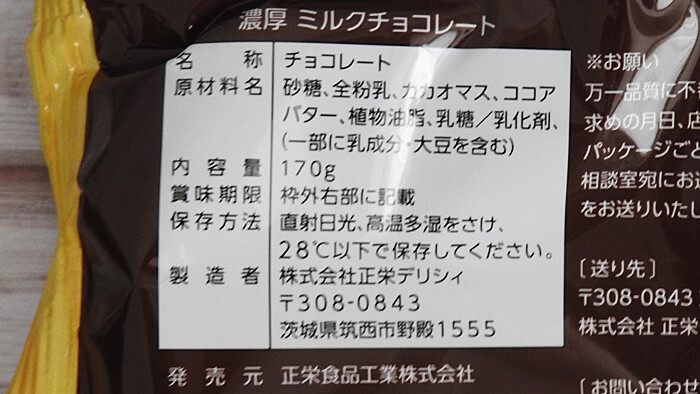「濃厚ミルクチョコレート」では、フランス産のミルクを使用したチョコレートですが、製造者は「株式会社正栄デリシィ」という茨城県の菓子製造販売会社なんですよ。なお、パッケージには、何かあった時の為の問い合わせ先や品質に不備があった場合の送り先が明記されていました。