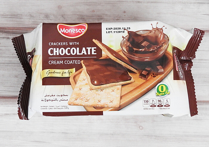 クラッカーにチョコレートが塗られているチョコ系スイーツ・業務スーパー「チョコクリームクラッカー」118円(税別)。あまりスイーツのイメージがないインドネシア産のチョコ系スイーツです。